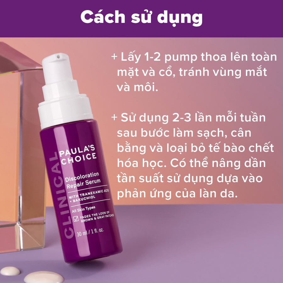 Trả lời: Với cơ chế ức chế quá trình hình thành sắc tố, tăng cường tái tạo da, sản phẩm Clinical Discoloration Repair Serum có khả năng cải thiện nám, tàn nhang, các đốm nâu và cả các vết thâm mụn.