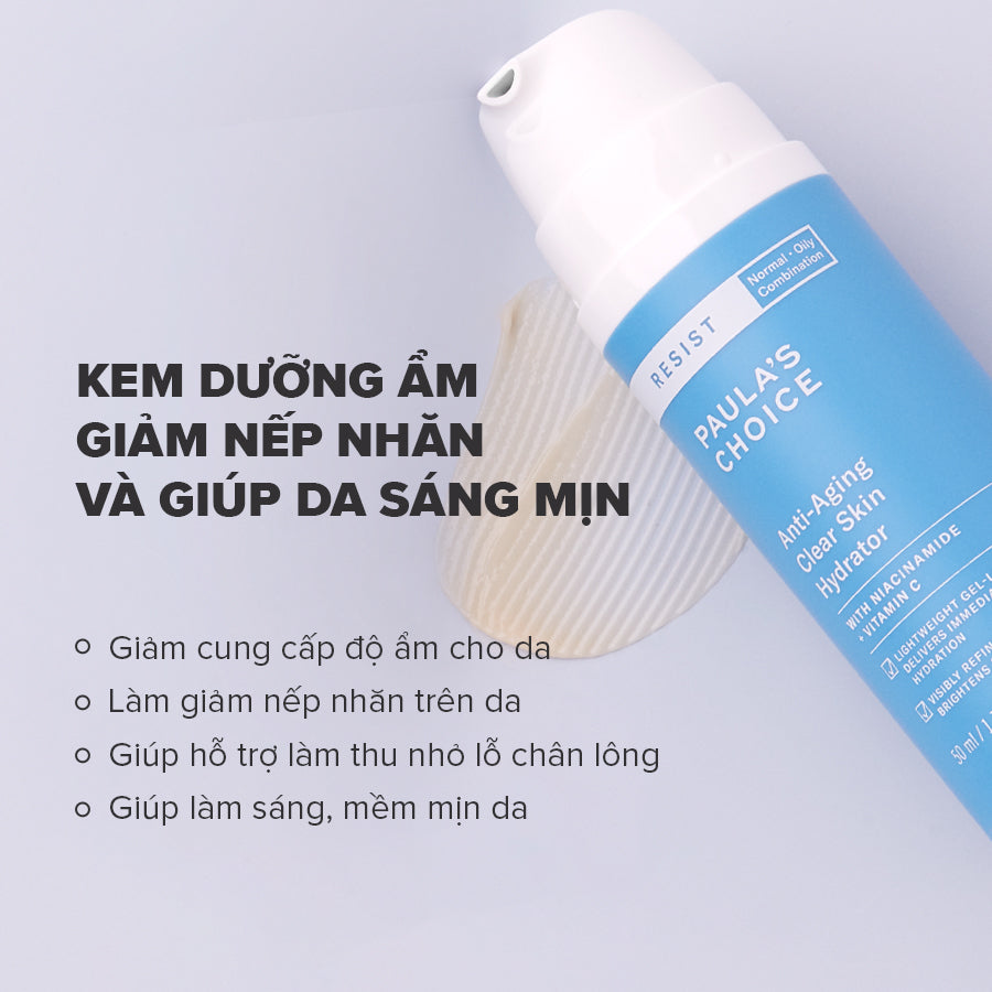 Paula's Choice Skincare đã nghiên cứu và phát triển Kem dưỡng ẩm Resist Clear Skin Hydrator với công thức độc quyền chứa cả Niacinamide và Vitamin C ổn định giúp tăng cường khả năng tự phục hồi và giảm các dấu hiệu lão hóa trên da. Bạn vẫn thể thêm các sản phẩm có chứa Retinol vào quy trình chăm sóc da hàng ngày để có kết quả tốt hơn. Với da dầu mụn, Tinh chất chống lão hóa 1% Retinol Booster là gợi ý hoàn hảo dành cho bạn