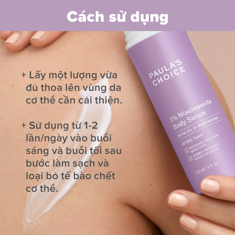 Sử dụng từ 1-2 lần/ngày vào buổi sáng và buổi tối sau bước làm sạch và loại bỏ tế bào chết cơ thể. Vào ban ngày, luôn thoa kem chống nắng phổ rộng SPF 30 trở lên để bảo vệ da toàn diện