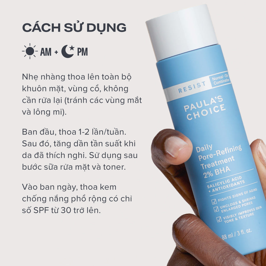 Sử dụng kết hợp Resist Daily Pore-Refining Treatment 2% BHA và AHA của Paula’s Choice trong quy trình chăm sóc da giúp giải quyết các vấn đề về da như tổn thương do ánh nắng, nếp nhăn sâu, lỗ chân lông bị tắc, mụn ẩn nhanh chóng hơn. Bạn có thể sử dụng xen kẽ tùy theo nhu cầu của làn da. Để biết thêm thông tin về cách kết hợp, vui lòng liên hệ với đội ngũ Chăm sóc khách hàng Paula’s Choice để được tư vấn miễn phí.