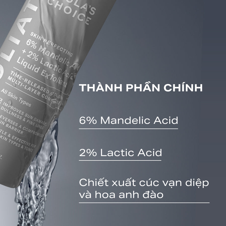 6% Mandelic Acid + 2% Lactic Acid Liquid Exfoliant là sản phẩm loại bỏ tế bào chết chứa AHA có kết cấu liquid lỏng đầu tiên của Paula’s Choice. Vượt xa hơn cả công dụng tẩy da chết bề mặt, sản phẩm còn giúp tái tạo, phục hồi tổn thương và tăng cường hàng rào bảo vệ tối ưu nhờ sự kết hợp độc đáo từ axit mandelic, axit lactic cùng các chiết xuất thiên nhiên dịu nhẹ