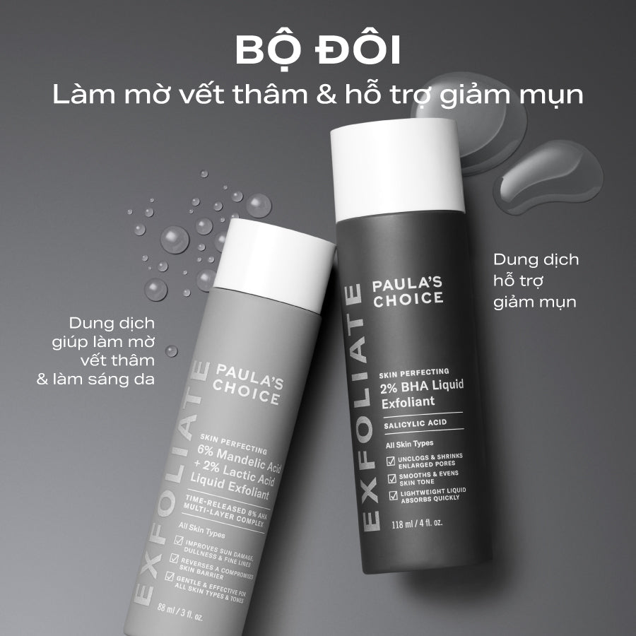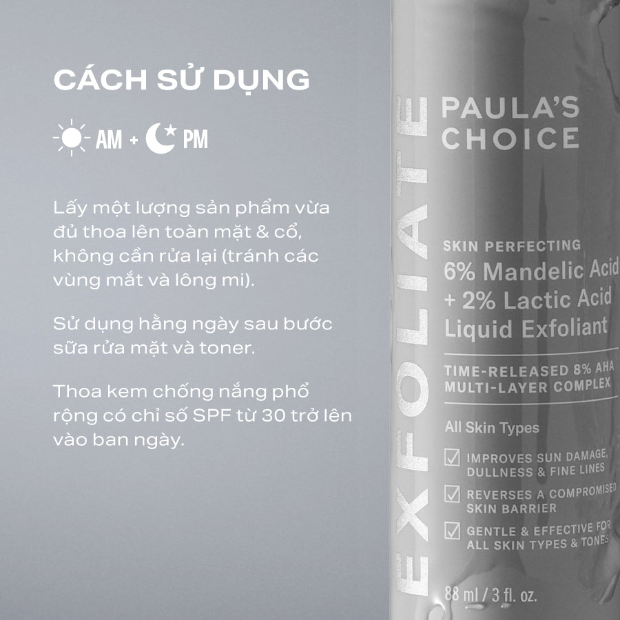 Sử dụng kết hợp SKIN PERFECTING 6% Mandelic Acid + 2% Lactic Acid Liquid Exfoliant và BHA của Paula’s Choice trong quy trình chăm sóc da giúp giải quyết các vấn đề về da như tổn thương do ánh nắng, nếp nhăn sâu, lỗ chân lông bị tắc, mụn ẩn nhanh chóng hơn. Bạn có thể sử dụng xen kẽ tùy theo nhu cầu của làn da. Để biết thêm thông tin về cách kết hợp, vui lòng liên hệ với đội ngũ Chăm sóc khách hàng Paula’s Choice để được tư vấn miễn phí.