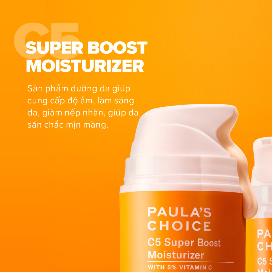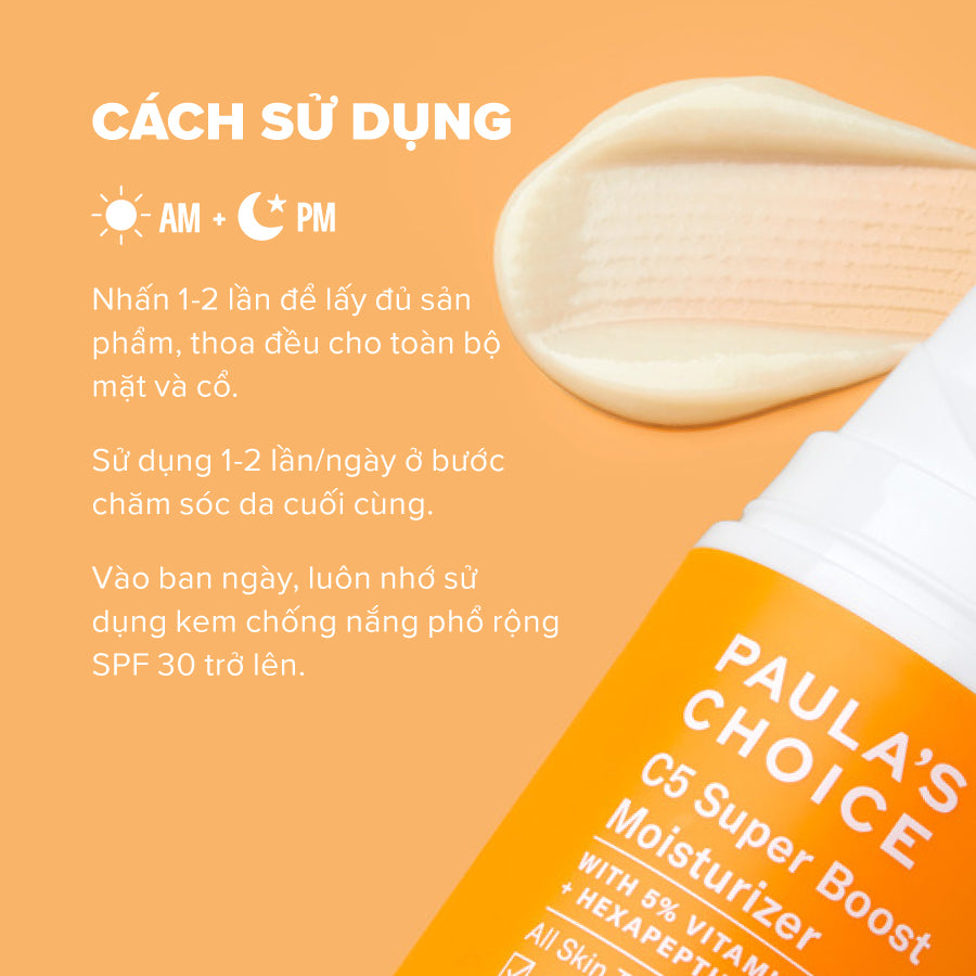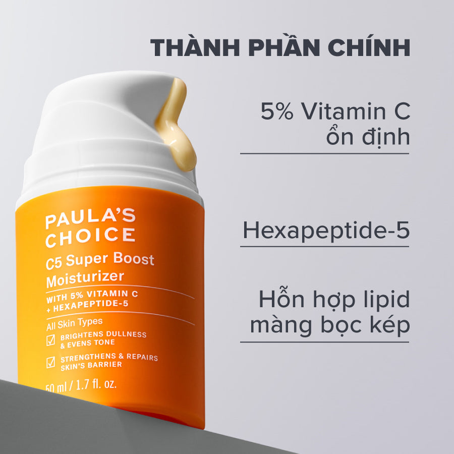 Công thức của C5 Super Boost Moisturizer được lựa chọn và nghiên cứu dựa trên độ ổn định, hiệu quả cũng như các quy định an toàn về thành phần mỹ toàn cầu. Cả hai dạng vitamin C có trong sản phẩm là 3-O ethyl ascorbic acid (3%) và ascorbyl glucoside (2%) đều có độ ổn định cao, hiệu quả và phù hợp với mọi loại da, kể cả da nhạy cảm hoặc mắc chứng chàm đỏ (rosacea).