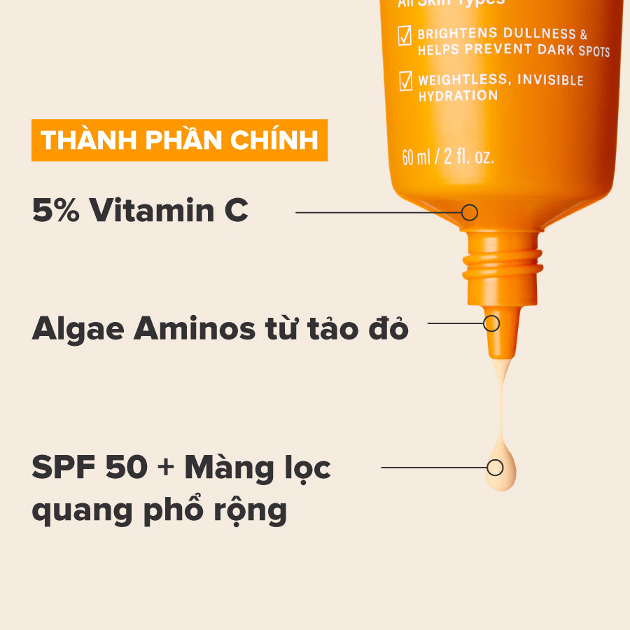 5% Vitamin C Sheer Moisturizer SPF 50 là sản phẩm chống nắng 3 tác động giúp Bảo vệ - Dưỡng sáng & Cấp ẩm tức thì cho da. Với công thức vượt trội từ 3 dẫn xuất vitamin C ổn định cùng chiết xuất gừng và acid amin từ tảo đỏ giúp làm sáng & cải thiện sắc tố, củng cố cũng như tăng cường hiệu quả bảo vệ da trước tác động tia UV.